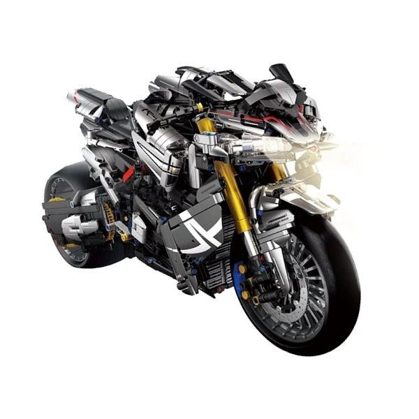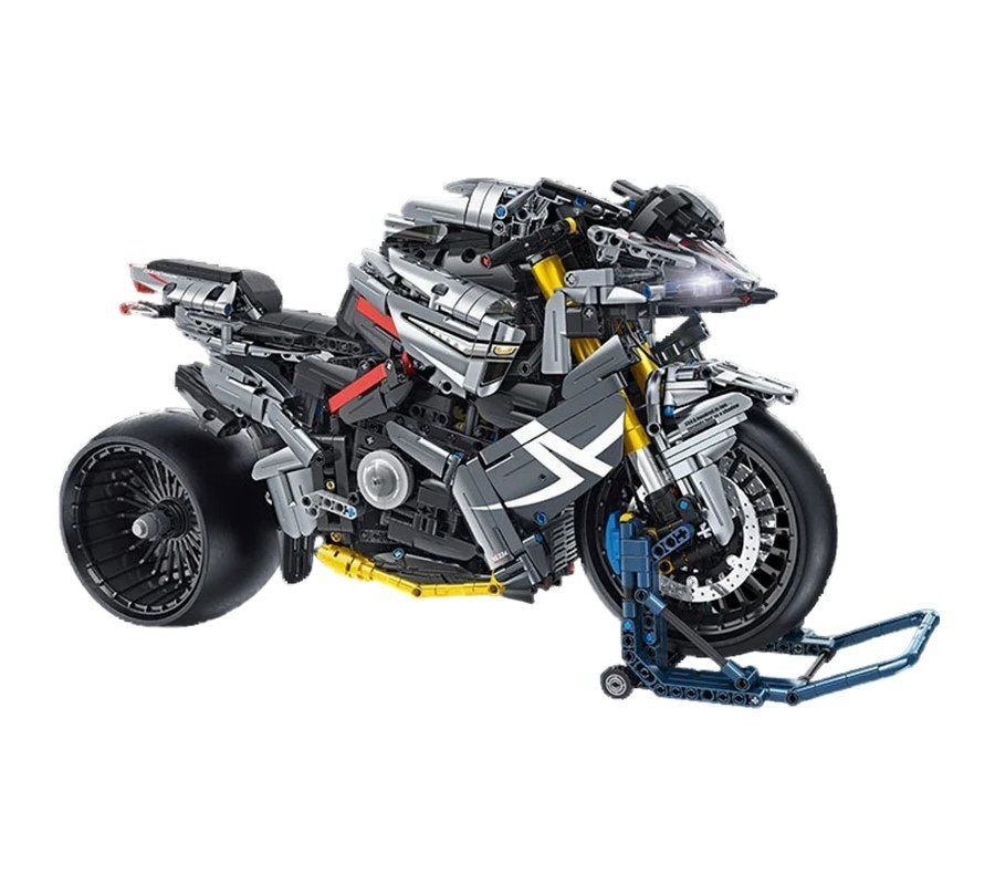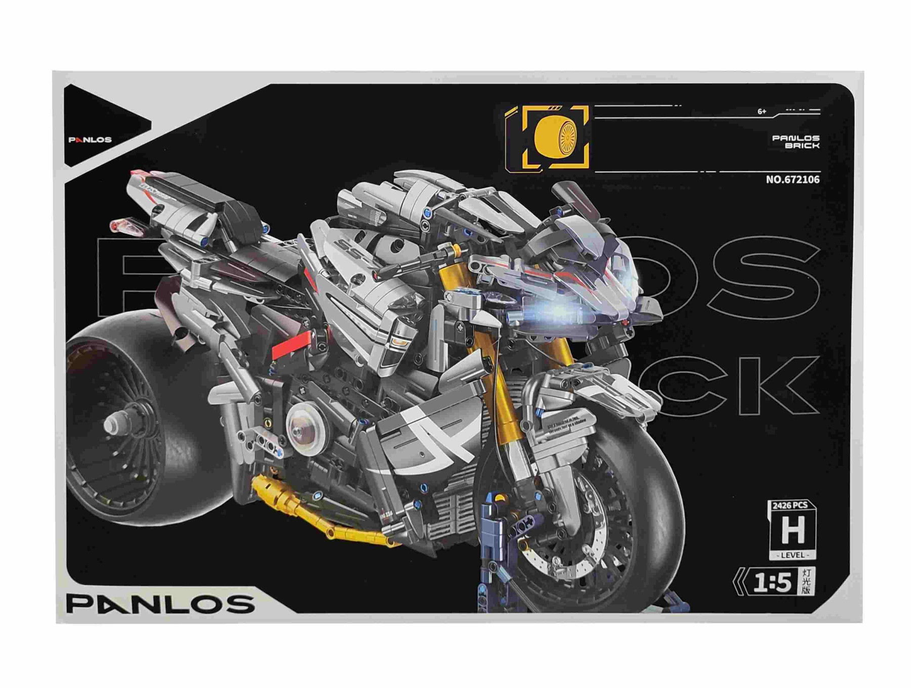 The Panlos 1/5 B-King Rapid Motorcycle with lights is a large-scale motorcycle model with 2,426 pieces, featuring a realistic design and built-in lighting for added visual effect. This detailed set captures the sleek aesthetics of a racing bike, complete with functional components and illuminated details, making it a striking display piece for brick-building enthusiasts.