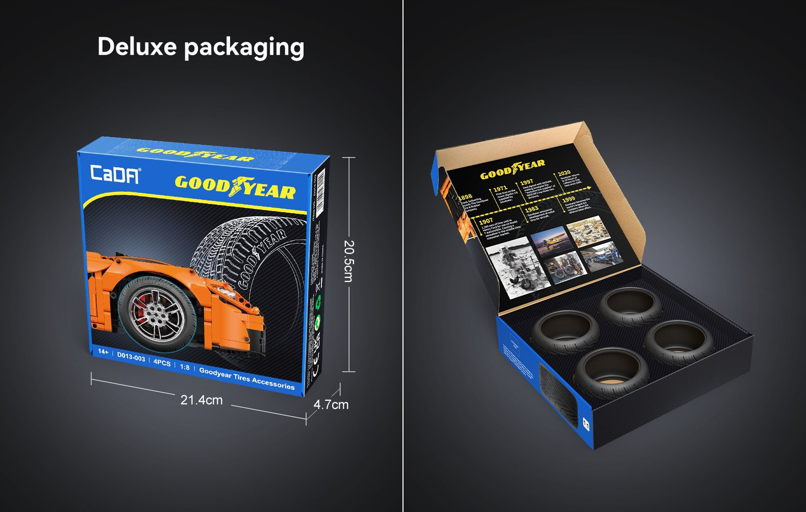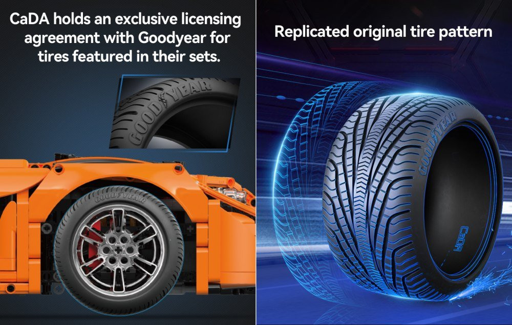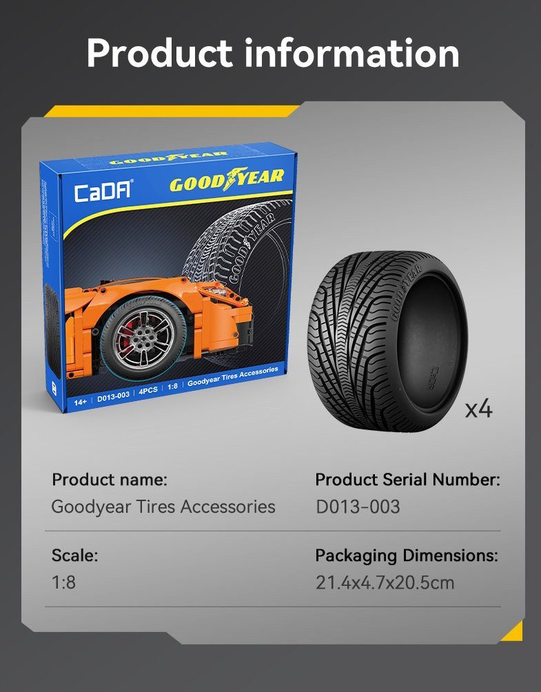 Introducing the Goodyear licensed tyre collection, exclusively licensed for CaDA. Available in sizes to perfectly fit 1/8 scale car models, these tyres are meticulously recreated with intricate detail and tyre patterns, delivering an authentic look and feel akin to real tyres.