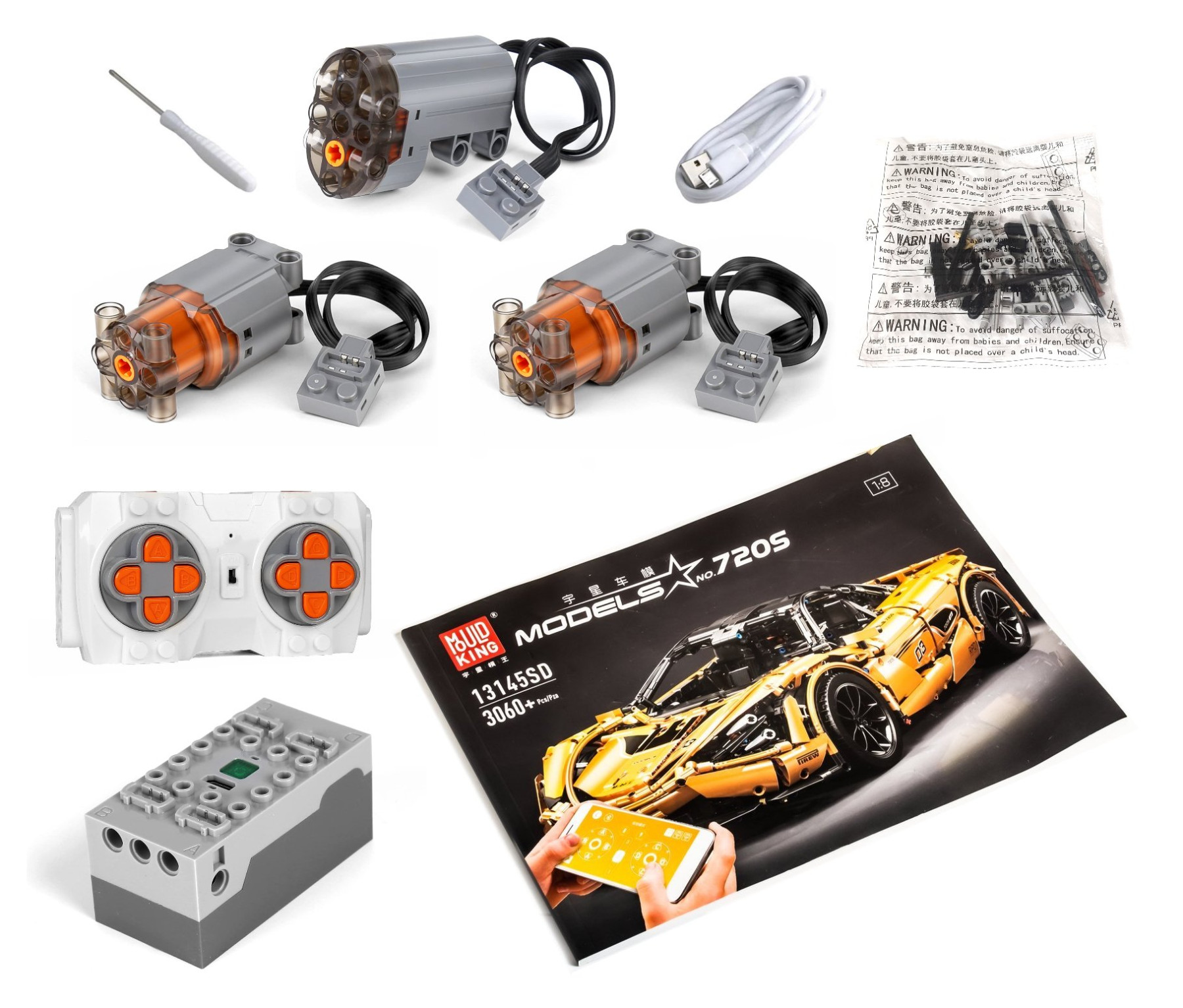 This is the Radio Control upgrade kit for Mould King item 13145 Mclaren 720S. This upgrade kit allows for static models to be converted into a R/C version for even more fun!